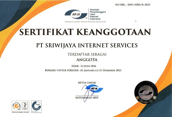 PT. SRIWIJAYA INTERNET SERVICES terdaftar sebagai anggota APJII (Asosiasi Penyelenggara Jasa Internet Indonesia) sejak 12-Juni-2016.