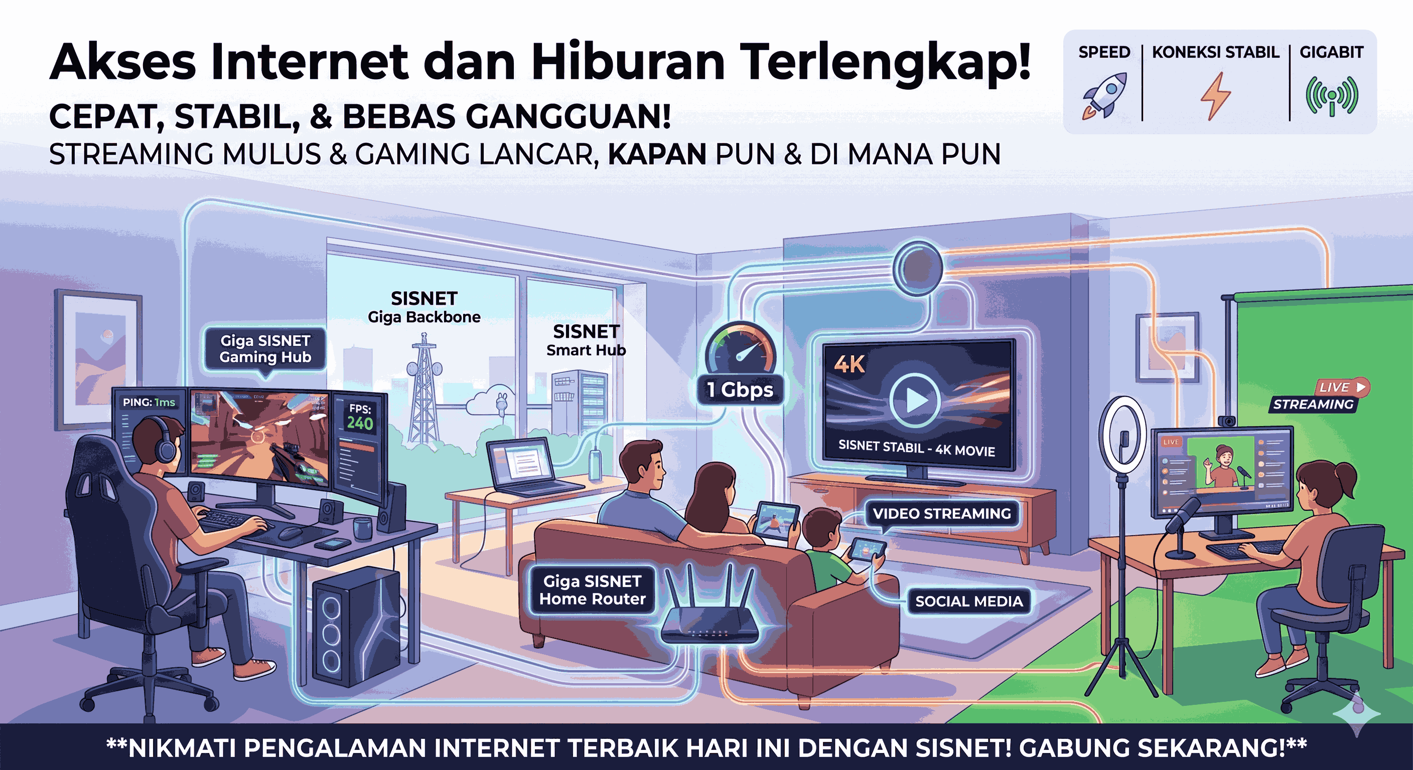 Rasakan serunya streaming mulus tanpa buffering dan gaming lancar tanpa lag dengan SISNET! Nikmati koneksi internet super cepat dan andal kapan pun, di mana pun. Jangan lewatkan kesempatan untuk bergabung dengan SISNET dan dapatkan pengalaman internet terbaik hari ini!